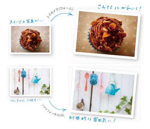 そのときの気持ちや撮りたい被写体に合わせてエフェクトを選ぶだけで、写真表現を楽しめる「ピクチャーエフェクト」機能。レトロな風合いになる「レトロフォト」をはじめ、柔らかな雰囲気に仕上がる「ソフトフォーカス」や明るく透明感のある写真が撮れる「ソフトハイキー」など、15種類のエフェクトを使って、飾りたくなるような写真を撮影できます。