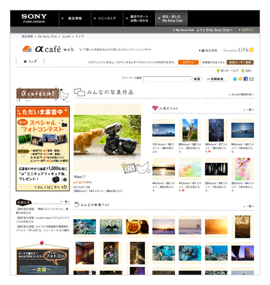 “α”ユーザーの作品を通して、“α”ユーザー同士でコミュニケーションが楽しめるWEBサイトが“αcafe”です。“αcafe”にはステキな写真がたくさん。好きな写真を集めたり、上手な先輩をフォローしたり。“α”で撮った写真を投稿することもできるので、一眼の楽しみがもっと広がります。ご購入を検討されている方も作品やコメントを閲覧できます。