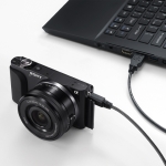 USBポートでの充電に対応しているので、付属のマイクロUSBケーブルでパソコンから充電できます。付属のACアダプターとマイクロUSBケーブルをつなげば、コンセントから直接カメラに充電できます。旅行やイベントのときも、かさばる充電器を持ち運ぶ必要がありません。