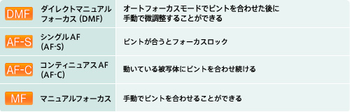 カメラが自動でピント合わせを行うオートフォーカスのほかに、手動でピント合わせるマニュアルフォーカス、オートフォーカスでピントを合わせた後に、手動でピントを微調整できる「ダイレクトマニュアルフォーカス(DMF)」機能があります。「DMF」は、AFとMFを瞬時に切り替えられるので、微妙なピント合わせに便利です。また、オートフォーカスモードには、「シングルAF(AF-S)」と「コンティニュアスAF(AF-C)」があります。