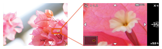 手動で細かなピント合わせを行いたいときに便利なのが「MFアシスト」機能です。画面の一部を約4.8倍または約9.6倍に拡大できるので、液晶画面で細部のピントを合わせられます。マニュアルフォーカスモードに設定しているときは、フォーカスリングを回転させると(*)、自動的に拡大表示に切り替わります。ダイレクトマニュアルフォーカス(DMF)時にも使えます。