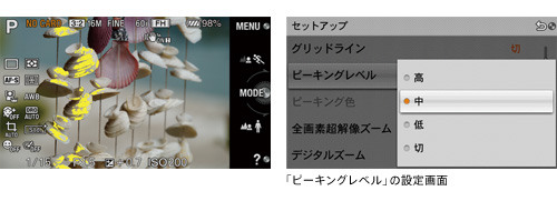 手動でピントを合わせるマニュアルフォーカス時に、画面内のシャープな部分を色つきで表示します。画面のどこにピントが合っているか一目で分かるので、細かなピント合わせを行うマクロやポートレート撮影に便利です。ピーキングの色は白、赤、黄色の3色から、ピーキングレベルは3段階から選べます。「ピーキング」機能は、Aマウントレンズ(*)を装着しているときも活用できます。