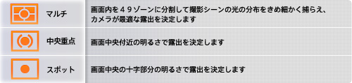 画面全体を49エリアに分割し、各エリアの測光データから適正な露出を決定する「マルチ測光」。画面中央部周辺に重点をおきながら全体の明るさも平均的に測光する「中央重点平均測光」、中央部のフォーカスエリア付近を測光する「スポット測光」から、好みやシーンに合わせて選択できます。シャッターボタンを半押しすることで、露出を固定できるAEロックも可能です。