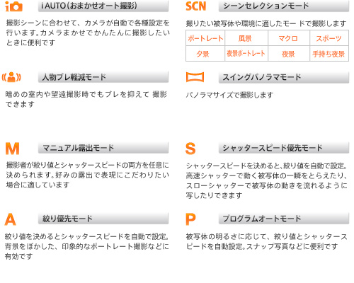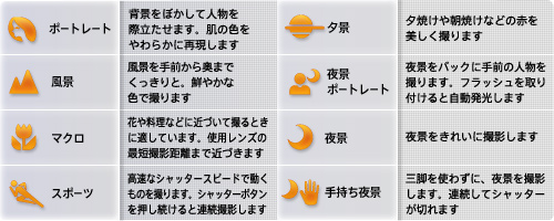 撮影シーンに応じてモードを選択するだけで、カメラが自動的に絞りやシャッタースピードはもちろん、ホワイトバランスや画質まで、シーンに最適になるようコントロールします。「ポートレート」「風景」「マクロ」「スポーツ」「夕景」「夜景ポートレート」「夜景」「手持ち夜景」モードの8種類から選択できます。