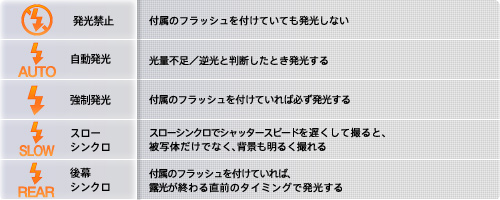 シーンの明るさに応じて自動で発光する「自動発光」、雰囲気のある夜景ポートレートが撮れる「スローシンクロ」、動きの軌跡を表現できる「後幕シンクロ」のほか、「強制発光」「発光禁止」のフラッシュモードを搭載しています。