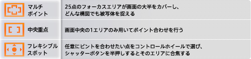 25点のフォーカスエリアが画面の大部分をカバーし、どんな構図でも被写体をとらえる「マルチポイント」。画面中央のみでピントを合わせる「中央重点」。ユーザーが任意にピントを合わせる位置を選べる「フレキシブルスポット」。3種類のフォーカスエリアから、被写体や構図にあわせて選択できます。