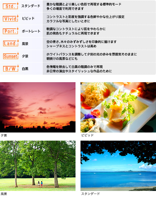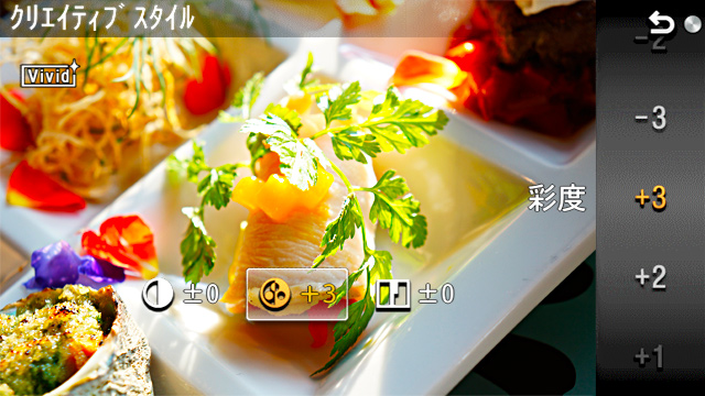 画像の仕上がりを自分のイメージに合わせて設定できる「クリエイティブスタイル」機能を搭載。「スタンダード」「ビビッド」「ポートレート」「風景」「夕景」「白黒」の6種類のモードから選択すれば、カメラが自動で最適な画像処理と調整を行います。コントラスト、彩度、シャープネスそれぞれの微調整が可能です。動画撮影時にも、「クリエイティブスタイル」機能を設定できます。