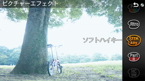 個性的な作品づくりを楽しめる「ピクチャーエフェクト」機能を搭載。「トイカメラ」や「ポップカラー」をはじめ、新たに搭載された「絵画調HDR(*)」「リッチトーンモノクロ(*)」「ソフトフォーカス(*)」「ミニチュア(*)」「ソフトハイキー」をはじめ、15種類のエフェクトを使って印象的な作品が撮れます。パソコンで画像加工しなくても、カメラの設定だけで自分らしい仕上がりを自由に楽しめます。