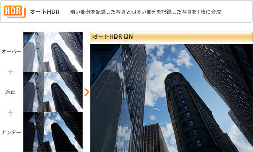 見たままの自然な印象を再現する「オートHDR」機能は、1回のレリーズで露出の異なる3枚の画像を連続露光。カメラ内で最適に自動合成を行い、1枚のJPEG画像を生成します。明るい領域をより鮮明に、暗い領域の階調もしっかりと残した描写が可能です。設定は「オート」のほか、露出差レベルを 1.0-6.0EV間で1.0EVごとに設定できる「露出差レベル設定」から選択できます。
