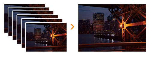 シーンセレクションの「手持ち夜景」モードなら、高速連写した6枚の画像を1枚に重ね合わせ、ノイズを増やすことなく高感度で撮影可能。三脚なしでブレの少ない夜景を手持ち撮影できます。