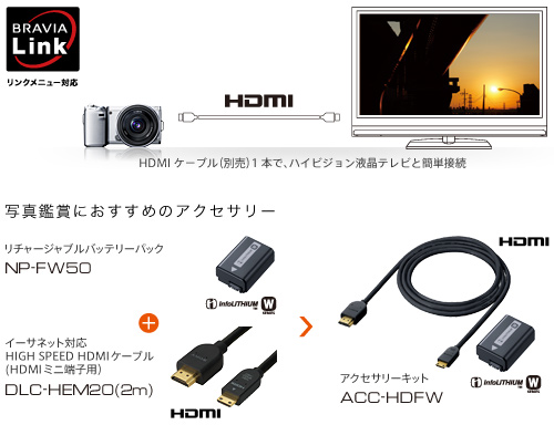 「ブラビアリンク」対応のソニーのハイビジョンテレビ〈ブラビア〉とつなげれば、カメラに保存した画像の再生やスライドショーなどが、〈ブラビア〉のリモコンで簡単に操作できます。