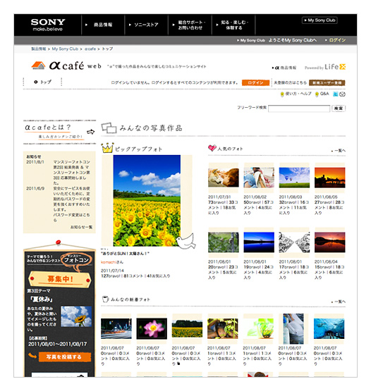 “α”で撮った写真を投稿したり、みんなの作品にコメントを書きこんだり。“α”ユーザーの作品を通して、“α”ユーザー同士でコミュニケーションが楽しめるWEBサイト“αcafe”。“α”ユーザーはもちろん、ご購入を検討されている方も作品やコメントの閲覧が可能です。