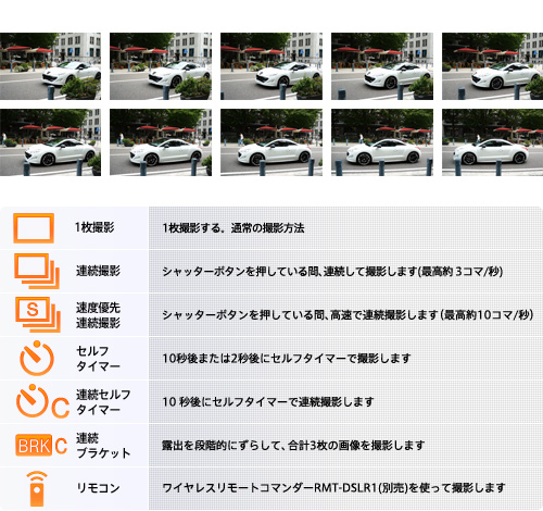 有効約1610万画素の高画素でありながら、「速度優先連続撮影」モードで、最高約10コマ/秒の高速連写を実現。決定的瞬間や一瞬の表情を逃さずとらえられます。また、ドライブモードは、通常の「連続撮影」モードをはじめ、「セルフタイマー」「連続ブラケット」まで、幅広く対応しています。