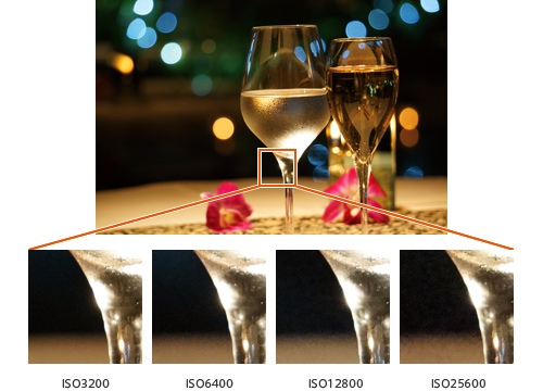 ISO AUTO時はISO感度を100-3200の範囲でカメラがシーンに応じて自動設定します。手動で設定すれば、ISO感度を最高25600まで設定可能で、キャンドルライトなどのわずかな光でも被写体を鮮明にとらえ、薄暗い場所でも三脚やフラッシュなしで撮影できます。さらに、セットアップメニューから高感度ノイズリダクション機能を設定可能。長秒時ノイズリダクションは「入/切」、高感度ノイズリダクションは「標準/弱」を選択でき、高感度撮影時のノイズを徹底的に抑えます。