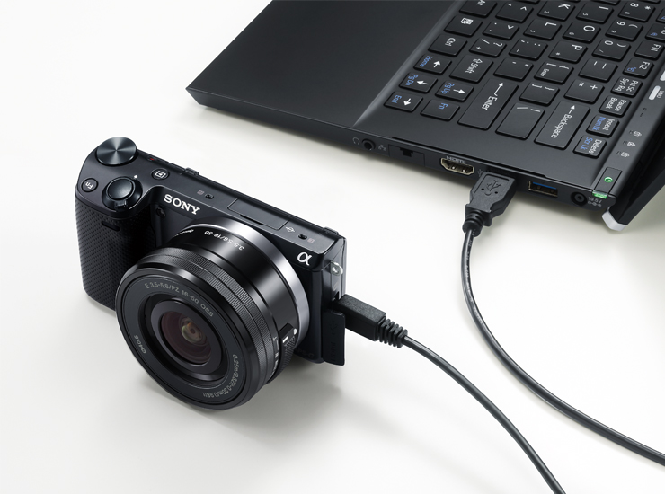 NEX-5RではUSBポートを使った充電方法を採用。付属のACアダプターとマイクロUSBケーブルにつなぐことで、バッテリーをカメラ本体から外すことなくコンセントから充電できます。また、パソコンからマイクロUSBケーブルを介しての充電も可能。旅行の際に、かさばる充電器を持ち運ぶ必要もありません。