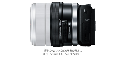NEX-5Rのキットレンズとして新たに開発された標準ズームレンズE PZ 16-50mm F3.5-5.6 OSSは、リトラクタブル機構を採用し、従来の標準ズームレンズ(*)の約半分のまで薄型化に成功。全長約29.9mmの軽量・薄型レンズは、カメラ本体に装着したままでもカバンにコンパクトにおさまり、より持ち運びやすくなりました。