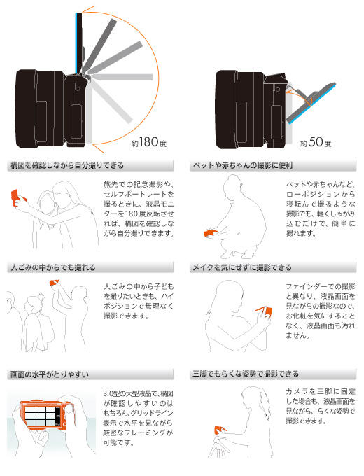 小型ボディはそのままに、自由なアングルやポジションで撮影できる180度チルト可動式液晶モニターを搭載しました。上方向は約180度、下方向は約50度まで角度調節が可能。いつもと違った視点を発見できたり、大きな液晶画面を見ながら、らくな姿勢で撮影できたりと、シーンに応じて自在に角度を調節できるので便利です。