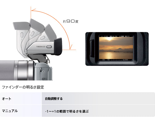 XGA有機ELを採用した視野率約100%、高精細約235万ドットの電子ビューファインダー(別売)。高コントラストで視野角も約33.1度と広く、幅広い状況下で優れた視認性を発揮します。カメラの設定から撮影、画像の確認までファインダーをのぞいたまま快適に行えます。また、上方向約 0-90度の角度調整やファインダーの明るさ設定も可能です。