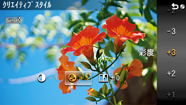 画像の仕上がりを自分のイメージに合わせて設定できる「クリエイティブスタイル」機能を搭載。「スタンダード」「ビビッド」「ポートレート」「風景」「夕景」「白黒」の6種類のモードから選択すれば、カメラが自動で最適な画像処理と調整を行います。コントラスト、彩度、シャープネスそれぞれの微調整が可能です。動画撮影時にも、「クリエイティブスタイル」機能を設定できます。