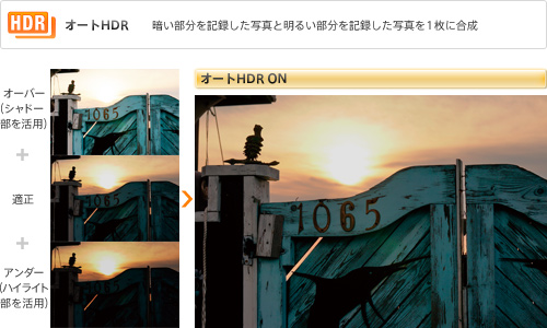 見たままの自然な印象を再現する「オートHDR」機能は、1回のレリーズで露出の異なる3枚の画像を連続露光。カメラ内で最適に自動合成を行い、1枚のJPEG画像を生成します。明るい領域をより鮮明に、暗い領域の階調もしっかりと残した描写が可能です。設定は「オート」のほか、露出差レベルを 1.0-6.0EV間で1.0EVごとに設定できる「露出差レベル設定」から選択できます。