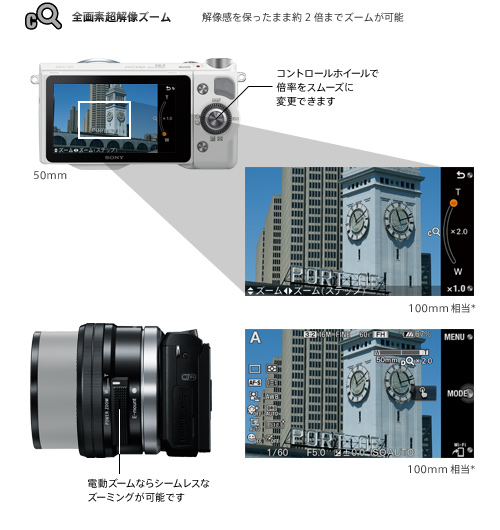お持ちのレンズでさらに遠くの被写体に寄りたいときに便利な「全画素超解像ズーム」。解像感を保ったままさらに約2倍までズームアップできるので、撮りたい被写体により大きく迫り、高画質のまま残せます。単焦点レンズでも約2倍までのズームが可能になり、単焦点レンズならではの明るさを生かしたズーム撮影が楽しめます。また、標準ズームレンズのE PZ 16-50mm F3.5-5.6 OSSなら、ズームレバー/ズームリングによる操作で電動ズームによる光学ズームから「全画素超解像ズーム」まで、シームレスなズーミングが可能です。