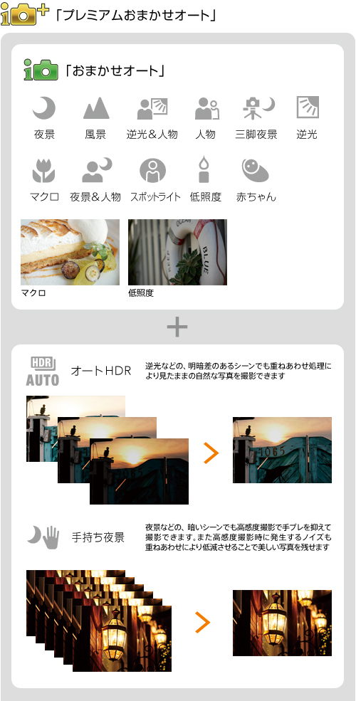 撮影状況やシチュエーションを見分けて、絞りやシャッタースピード、ISO感度、ホワイトバランスなどを最適な設定に自動調整する「おまかせオート」に加え、NEX-5Rではさらに、認識したシーンに応じて最適な撮影機能を自動的に呼び出して撮る「プレミアムおまかせオート」を搭載。逆光時は「オートHDR(ハイダイナミックレンジ)」、夜景では「手持ち夜景」モードなど、高度な撮影機能を手軽に使えるので、シャッターを押すだけでAPS-Cクオリティーを生かしたキレイな写真が簡単に撮れます。呼び出す機能は、撮影前に表示されるのでシーンに適したカメラ設定が分かり、写真のスキルアップにも役立ちます。