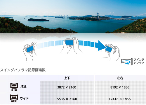 雄大な風景を1枚のパノラマ写真にできる「スイングパノラマ」機能を搭載。シャッターボタンを押してカメラを一振りするだけで、自動的に連続撮影し、カメラ内で高精度に位置を合わせて1枚の画像としてつなぎ合わせます。これまで画面に収まりきらなかった広大な風景や構造物を、簡単にパノラマ写真にできます。