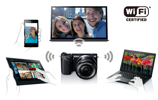 “α”で初めて「Wi-Fi対応ワイヤレス通信」機能を搭載。撮った写真をその場でスマートフォンやタブレットにダイレクト転送(*)したり、PCにワイヤレスで保存したりと、写真の共有、鑑賞、保存までが快適に行えます。