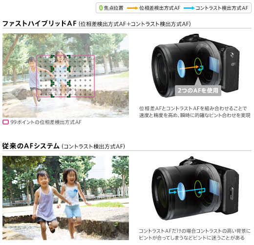 ※ レンズキットに同梱のレンズは出荷時点でファストハイブリッドAFに対応しています。その他のレンズ(E 16mm F2.8を除く)で位相差検出方式AFを可能にするには、ボディおよびレンズのファームウェアアップデートが必要な場合があります