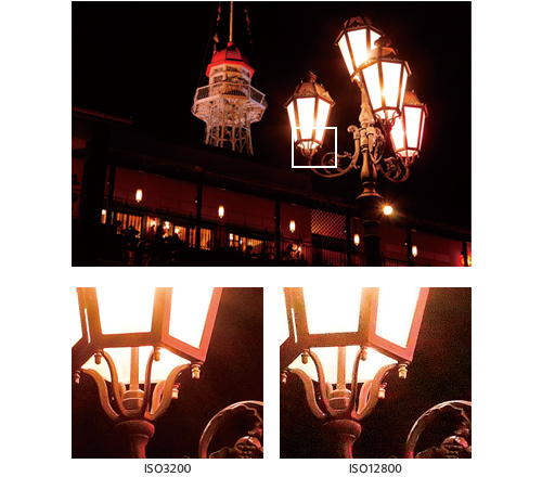 ISO AUTO時は、カメラがISO感度を100-3200の範囲で自動で設定し、暗いシーンでも鮮やかな写真が手軽に撮れます。手動で設定すれば、さらにISO感度を最高25600まで上げられるので、キャンドルライトなどのわずかな光でも被写体を鮮明にとらえ、三脚やフラッシュなしで撮影できます。また、セットアップメニューから高感度ノイズリダクション機能を設定でき、高感度撮影時のノイズを徹底的に抑えます。