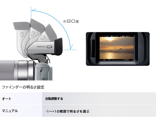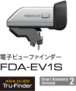 XGA有機ELを採用した視野率約100%、高精細約235万ドットの電子ビューファインダー(別売)。高コントラストで視野角も約33.1度と広く、幅広い状況下で優れた視認性を発揮します。カメラの設定から撮影、画像の確認までファインダーをのぞいたまま快適に行えます。また、上方向約 0-90度の角度調節やファインダーの明るさ設定も可能です。