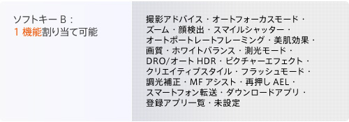 * フォーカス切換、AFモード、AFエリア、顔検出、スマイルシャッター、オートポートレートフレーミング、美肌効果、画質、ISO感度、ホワイトバランス、測光モード、DRO/オートHDR、ピクチャーエフェクト、クリエイティブスタイル、フラッシュモードから最大6項目を任意に設定可能