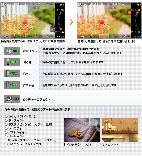 写真やカメラの詳しい知識がなくても、思い通りの写真表現を手軽に楽しめる「マイフォトスタイルタッチ」を搭載。自在にぼけ具合を調節できる「背景ぼかし(*)」をはじめ、「色あい」「明るさ」「鮮やかさ」「ピクチャーエフェクト」の5つの効果を、液晶画面を見ながら調節できます。各効果は重ね合わせが可能なので、「背景ぼかし」の後に「色あい」の効果を重ね合わせるなど、自分の思い描いたイメージを画面で確認しながら写真を仕上げられます。設定は「おまかせオート」または「プレミアムおまかせオート」から、コントロールホイールやソフトキー、タッチパネルで設定可能。また、「マイフォトスタイルタッチ」は、動画撮影時にも活用できます。