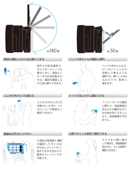小型ボディはそのままに、自由なアングルやポジションで撮影できる180度チルト可動式液晶モニターを搭載しました。上方向は約180度、下方向は約50度まで角度調節が可能。いつもと違った視点を発見できたり、大きな液晶画面を見ながら、らくな姿勢で撮影できたりと、シーンに応じて自在に角度を調節できるので便利です。