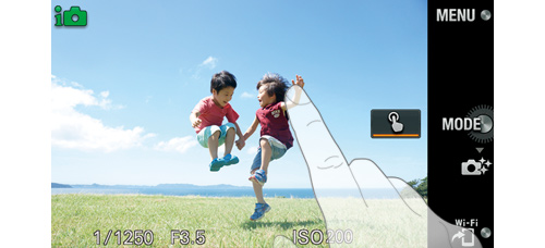 NEX-5Tは、設定変更やアプリの選択はもちろん、被写体にピントを合わせてシャッターを切り、再生するところまで、すべてをタッチパネルで操作可能。背面のコントロールホイールとソフトキーとの併用も可能なので、タッチ操作とダイヤル操作を状況に応じて使い分けることで、スムーズに撮影できます。また、タッチ操作はセットアップメニューで無効化もできます。