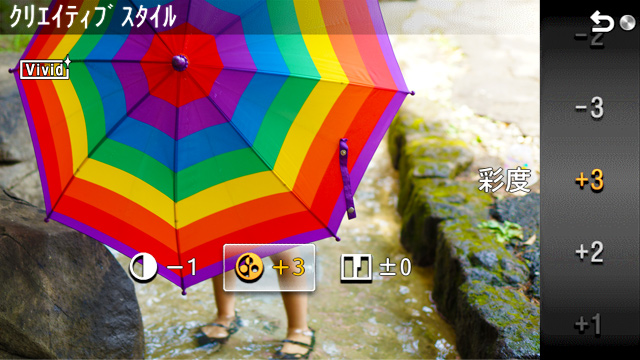 画像の仕上がりを自分のイメージに合わせて設定できる「クリエイティブスタイル」機能を搭載。「スタンダード」「ビビッド」「ポートレート」「風景」「夕景」「白黒」の6種類のモードから選択すれば、カメラが自動で最適な画像処理と調整を行います。コントラスト、彩度、シャープネスそれぞれの微調整が可能です。動画撮影時にも、「クリエイティブスタイル」機能を設定できます。