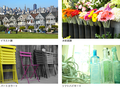 “PlayMemories Camera Apps”でダウンロードできる「ピクチャーエフェクト+」アプリを追加すれば、新たに6つのエフェクトが使用可能。「水彩画調」「イラスト調」「ソフトハイキー+」「パートカラー+」などの新しいエフェクトで、写真表現の幅がさらに広がります。