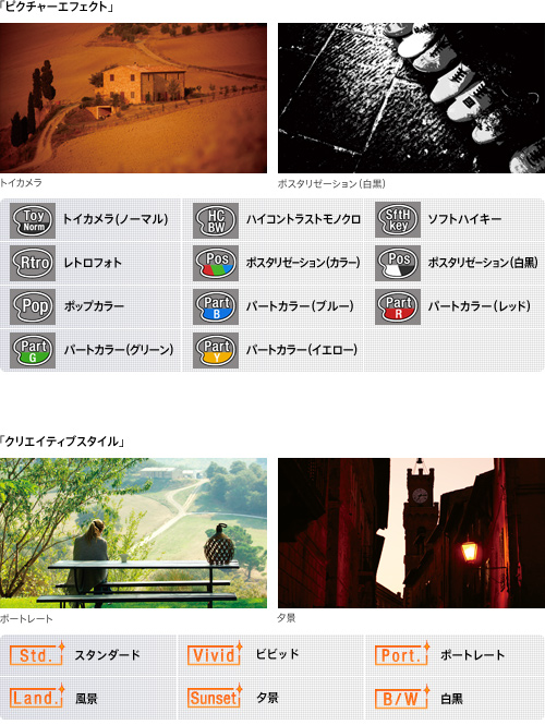 動画撮影時でも、こだわりの表現を手軽に楽しめる「ピクチャーエフェクト(*1)」機能を設定可能。表現したいイメージに合わせて、エフェクトを選択できます。また、仕上がりイメージを好みに合わせて設定できる「クリエイティブスタイル(*2)」機能も設定可能です。