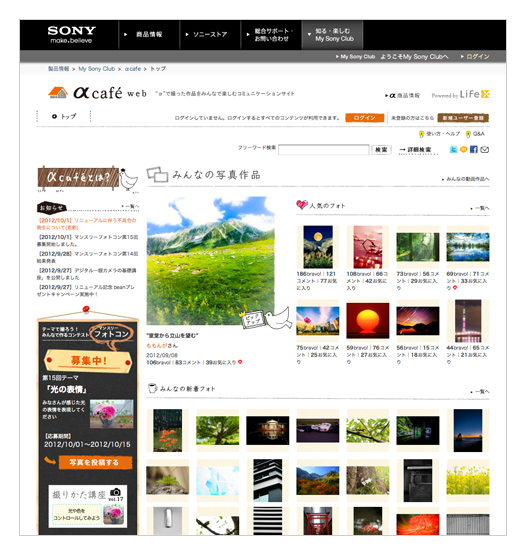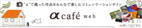 “α”で撮った写真を投稿したり、みんなの作品にコメントを書きこんだり。“α”ユーザーの作品を通して、“α”ユーザー同士でコミュニケーションが楽しめるWEBサイト“αcafe”。“α”ユーザーはもちろん、ご購入を検討されている方も作品やコメントの閲覧が可能です。