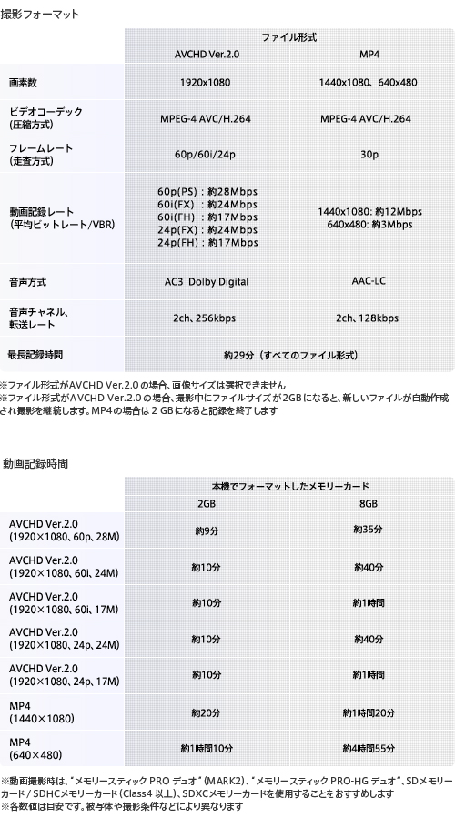 美しいフルハイビジョン動画を録画できる高圧縮率の「AVCHD Ver.2.0」と、ブログや動画投稿サイトなどへのアップが手軽に行える「MP4」の2ファイル形式に対応しています。