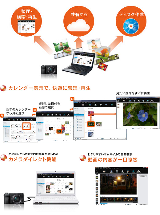 付属ソフト“PlayMemories Home”を使えば、写真だけでなく動画もカレンダー表示でかんたんに整理・検索・再生が行えます。パソコンをつなぐだけで、カメラ内の映像を取りこまなくても見ることも可能です。さらに、パソコンに取りこんで編集したり、DVDを作成したり、便利な機能を使って楽しくかんたんに管理、活用できます。