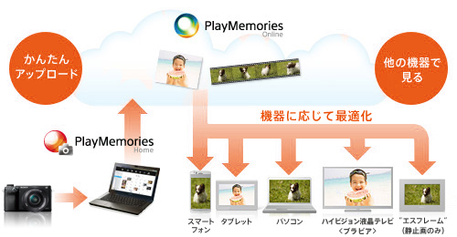 撮った写真や映像をクラウドサービス“PlayMemories Online”にドラッグ&ドロップでアップロードでき、自分の写真や動画を〈ブラビア〉、タブレットなど多彩な機器で見られます。また、かんたん操作でFacebook、YouTube、mixiなどのネットワークサービスにアップロードできます。