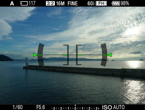 液晶モニターはもちろん、ファインダー内にもグリッドラインを表示できるので、水平や垂直の傾きを補正しながら、緻(ち)密なフレーミングが可能です。