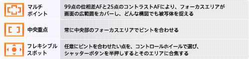 99点の位相差AFと25点のコントラストAFにより、フォーカスエリアが画面の広範囲をカバーし、どんな構図でも被写体をとらえる「マルチポイント」。画面中央のみでピントを合わせる「中央重点」。 ユーザーが任意にピントを合わせる位置を指定できる「フレキシブルスポット」。3種類のフォーカスエリアから、被写体や構図にあわせて選択できます。
