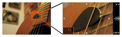 ダイレクトマニュアルフォーカス(DMF)時を含む、手動でのピント合わせを行うときに便利なのが「MFアシスト」機能です。画面の一部を約4.8倍または約9.6倍に拡大し、細部のピント合わせが可能です。マニュアルフォーカスモード設定時には、フォーカスリングの回転操作に連動して(*)自動的に拡大表示に切り替わります。