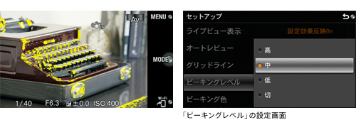 マニュアルフォーカス時に、画面内のシャープな部分を色つきで表示します。液晶モニターはもちろん、ファインダー内でもどこにピントが合っているかが一目で確認でき、細かなピント合わせを行うマクロやポートレート撮影に便利です。ピーキングの色は白、赤、黄色から選べ、ピーキングレベルは3段階から選択できます。また、Aマウントレンズ(*)を装着している際にも活用できます。