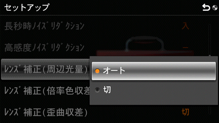 広角レンズや高倍率ズームレンズを使用したときに、レンズの周辺光量が落ちこみ画像の四隅が暗くなる場合や、直線が歪んだり、色ズレを起こしたりする場合があります。これを自動補正するのが「レンズ補正」機能です。αレンズ(Eマウントレンズ)の周辺光量低下や歪曲収差、倍率色収差を補正します。メニュー画面でそれぞれの項目ごとに設定できます。