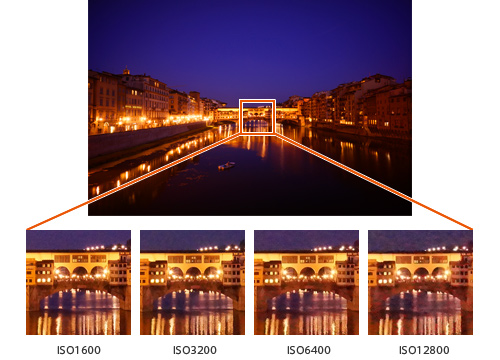 ISO AUTO時はISO感度を100-1600の範囲(*)でカメラがシーンに応じて自動設定します。手動で設定すれば、ISO感度を最高16000まで設定可能で、キャンドルライトなどのわずかな光でも被写体を鮮明にとらえ、薄暗い場所でも三脚やフラッシュなしで撮影できます。さらに、セットアップメニューから高感度ノイズリダクション機能を設定可能。長秒時ノイズリダクションは「入/切」、高感度ノイズリダクションは「強/標準/弱」を選択でき、高感度撮影時のノイズを徹底的に抑えます。