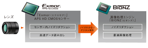 高解像度CMOSセンサーに最適化され、飛躍的な進化を遂げた画像処理エンジン「BIONZ(ビオンズ)」。有効約2430万画素もの圧倒的な高画素化により、大容量化するCMOSセンサーからの情報を高速・高精度に処理しながら、約10コマ/秒(*)の高速連写を実現するなど、負荷の高い画像処理にもスピーディーに対応。RAWノイズリダクションの信号処理プロセスの進化に加え、現像後にもノイズリダクションを実施し、低ノイズで高品位な画像を実現します。