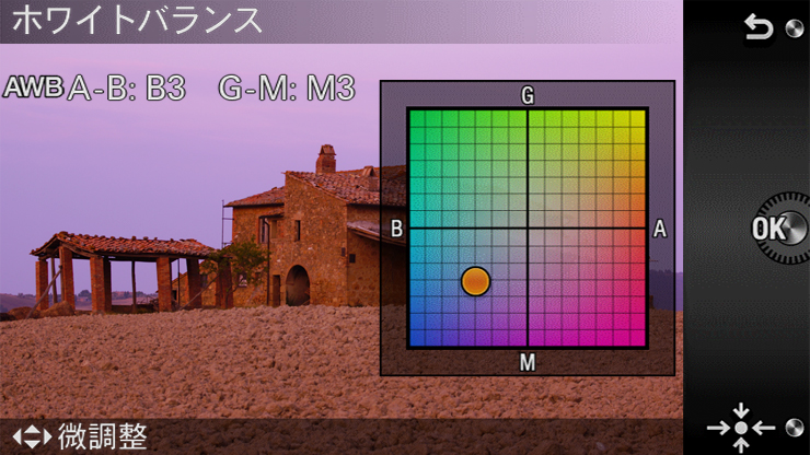 カメラがシーンの光源を自動で判定して、見たイメージに近い自然な色合いを再現する「オートホワイトバランス(AWB)」。そのほか、赤みや青みを強調したい場合には、「太陽光」「電球」「蛍光灯」などのプリセットモードから選択できます。さらに、「色温度&カラーフィルター」「カスタム」も搭載しています。また、「OPTION」を選択すれば、ホワイトバランスをライブビューで確認しながら表現に合わせて色合いを微調整できます。